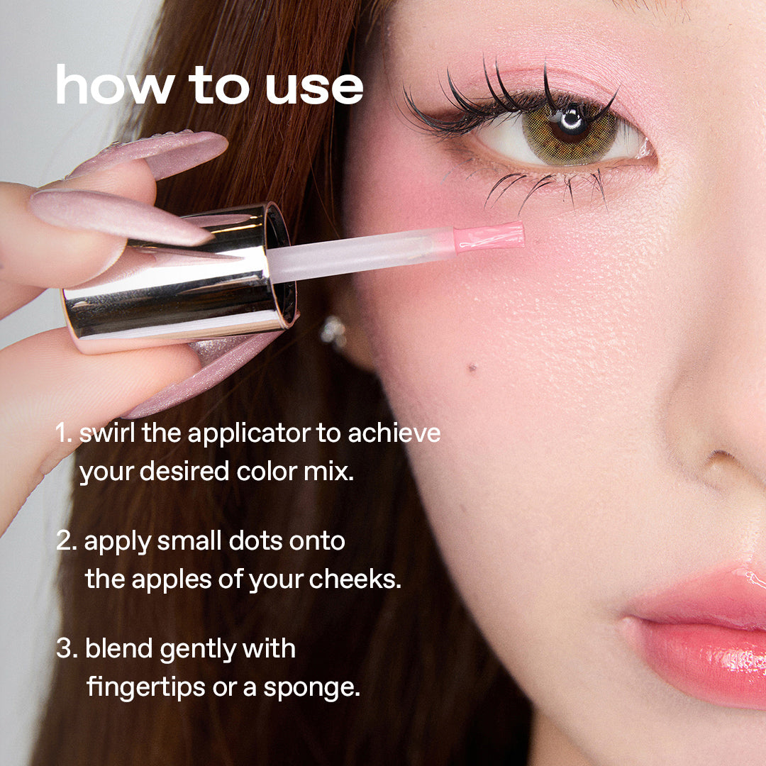 Simply twirl the applicator inside the bottle to achieve your desired colour mix. Blend on the back of your hand, then gently dab onto your cheeks with your fingers for a natural, radiant flush.