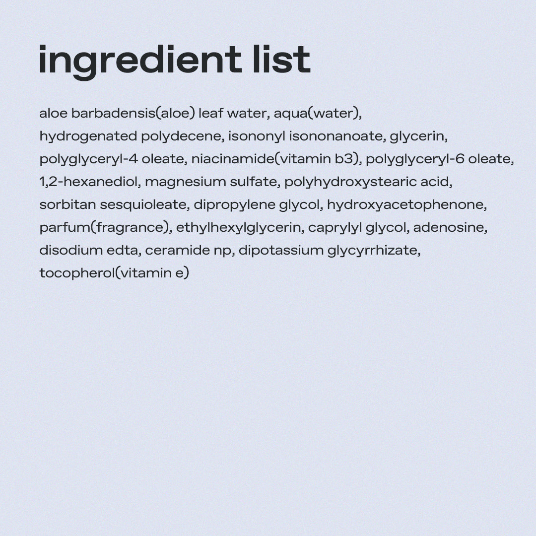 aloe barbadensis (aloe) leaf water, aqua (water), hydrogenated polydecene, isononyl isononanoate, glycerin, polyglyceryl-4 oleate, niacinamide (vitamin b3), polyglyceryl-6 oleate, 1,2-hexanediol, magnesium sulfate, polyhydroxystearic acid, sorbitan sesquioleate, dipropylene glycol, hydroxyacetophenone, parfum (fragrance), ethylhexylglycerin, caprylyl glycol, adenosine, disodium edta, ceramide np, dipotassium glycyrrhizate, tocopherol (vitamin e)