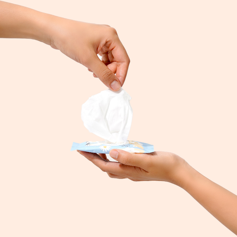 Open the sticker label. Remove/take out tissues as needed. Close the sticker label again. Wipe the tissue over the vaginal area from front to back.