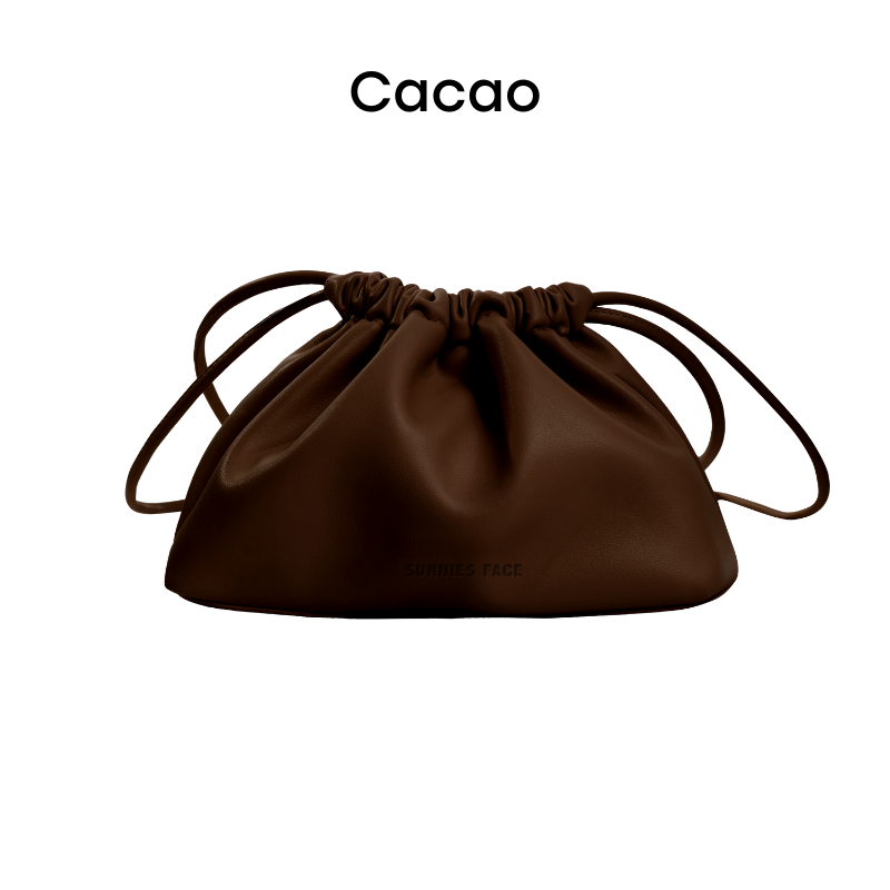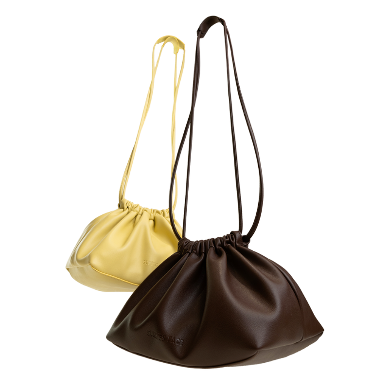 A PU leather drawstring bag designed for on-the-go use, with a soft, rounded silhouette, drawstring closure, and long straps for easy carry.