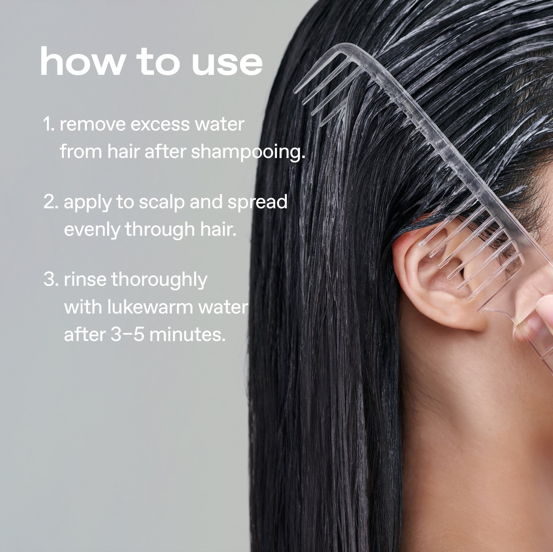 • Apply to the scalp and spread evenly through the hair using your fingers or a wide-toothed comb.