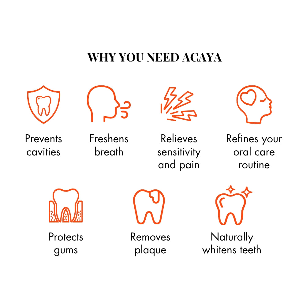 Note: Acaya toothpaste is made with natural oils which may give it a colour that is not perfectly white. Acaya avoids using unnecessary colourants for an artificially white appearance. The toothpaste colour does not impact its effectiveness