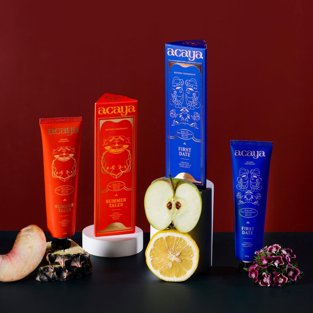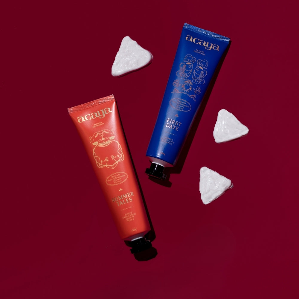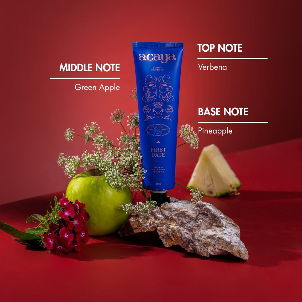 Premium toothpastes designed to bathe your teeth in great scent, exotic flavours, and cleansing ingredients – proven to prevent cavities and reduce sensitivity. Start moving through the day confidently with a tube of Acaya. When two shy, innocent souls embark on a romantically charged journey of companionship, the air is filled with delicate nuances of anticipation. First Date captures that moment on a floral field with a heart-fluttering blend of zesty verbena, crisp notes of green apple, and the sweet aroma of pineapple. This subtle mix of floral and citrus takes you to a world of gentle whispers and butterflies, making you feel like your relationship is just beginning as if it were the first day of spring. Make a lasting impression with Acaya's First Date, and let your journey of love begin.