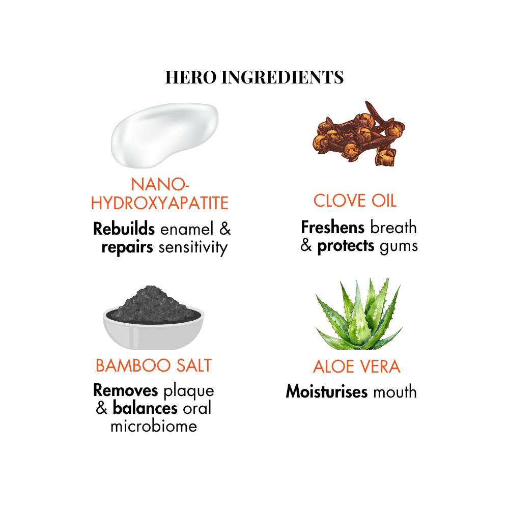 Star Ingredients Nano-hydroxyapatite • Rebuilds enamel, relieves pain and sensitivity, smoothens tooth surface • Gold standard ingredient for anti-cavity toothpastes in Japan Aloe Vera • Moisturizes and protects against bad breath and plaque Clove Oil • Freshens breath and protects gums Bamboo Salt • Balances oral pH and prevents bacteria build-up Ingredients Precipitated Calcium Carbonate, Sorbitol, Water, Nano-hydroxyapatite, Xylitol, Sodium Bicarbonate, Glycerin, Sodium Lauroyl Sarcosinate, Stevia Rebaudiana Leaf Extract, Flavour, Hydrated Silica, Carboxymethyl Cellulose, Tetrasodium Pyrophosphate, Bamboo Salt, Clove Oil, Aloe Barbadensis (Aloe Vera) Leaf Extract, Citric Acid.