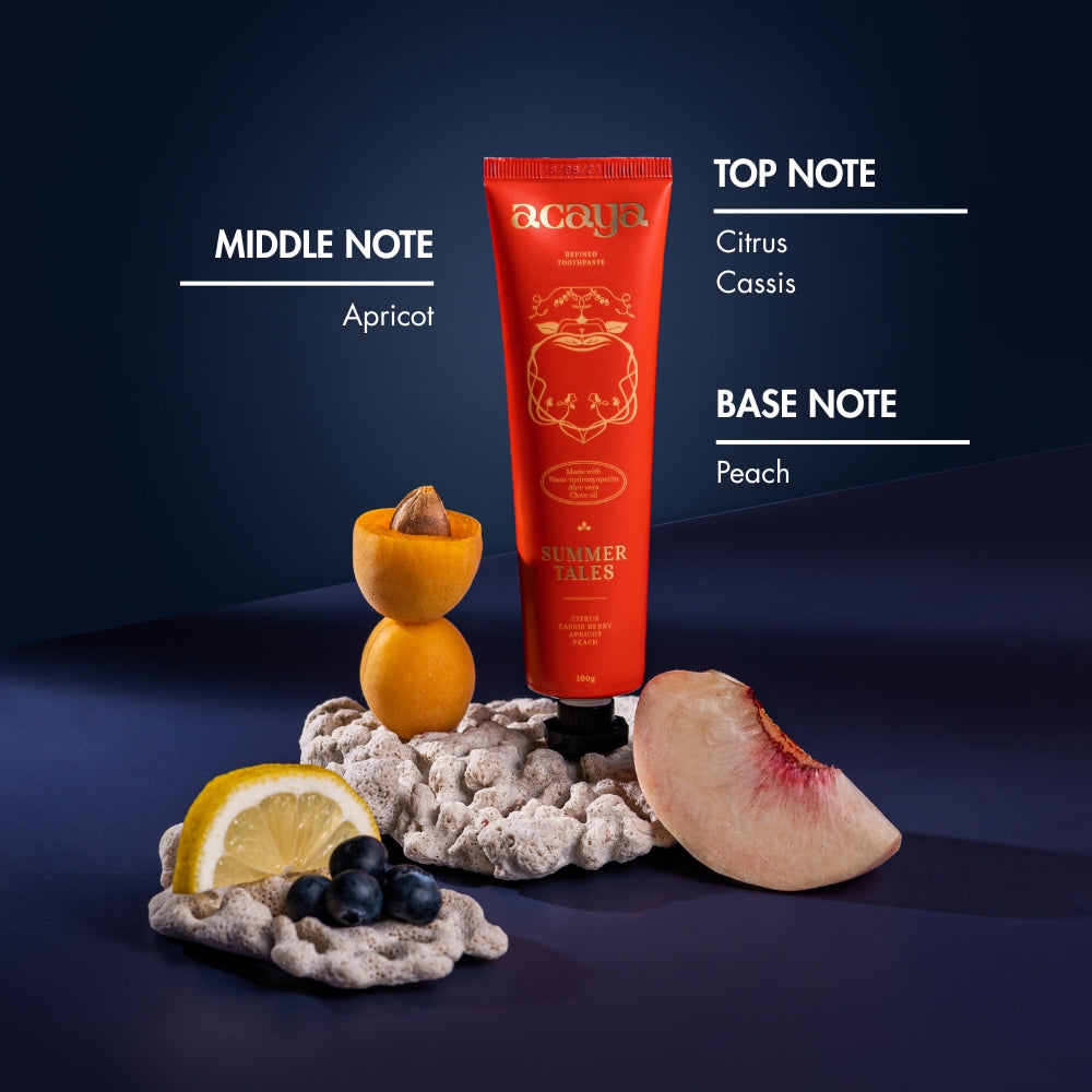 Premium toothpastes designed to bathe your teeth in great scent, exotic flavours and cleansing ingredients – proven to prevent cavities and reduce sensitivity. Start moving through the day confidently with a tube of Acaya. Feel that? It’s the cool, refreshing summer breeze hitting your face on a balmy evening as you watch the sun set over Andalusia. Ahhh... Summer Tales is infused with delightful summer fruit flavours that will transport you right to the heart of southern Spain with every breath. The freshness of citrus and the juicy notes of Peach, Apricot, and Cassis Berry embody the sensation of admiring summer sunsets. Treat yourself to an evening of Spanish enchantment and feel reinvigorated after brushing with Acaya's Summer Tales toothpaste.